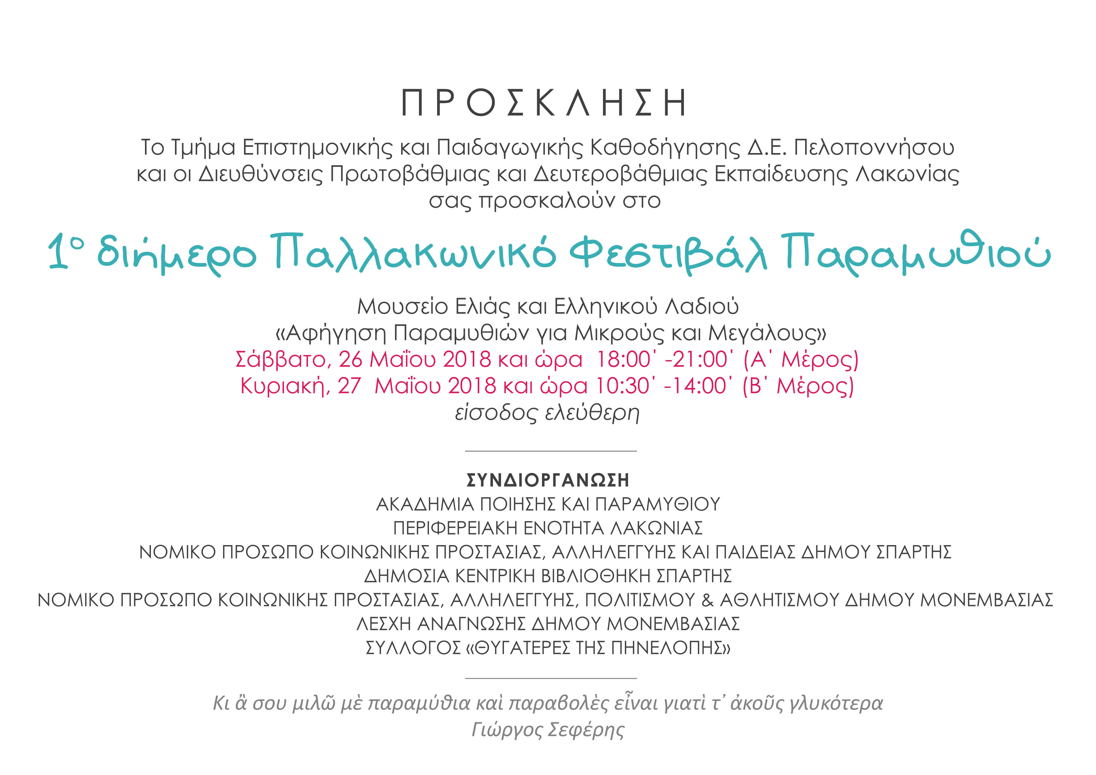 Οι Διευθύνσεις Πρωτοβάθμιας και Δευτεροβάθμιας Εκπαίδευσης Λακωνίας, δια των Γραφείων Σχολικών Δραστηριοτήτων και ΚΕ.ΣΥ.Π. (Κέντρο Συμβουλευτικής και Προσανατολισμού) Λακωνίας αντίστοιχα και το Τμήμα Επιστημονικής και Παιδαγωγικής Καθοδήγησης Δ.Ε. Πελοποννήσου διοργάνωσαν σε συνεργασία με την Ακαδημία Ποίησης και Παραμυθιού Βιωματικά Επιμορφωτικά Σεμινάρια, για το σχολικό έτος 2017-2018 , με θέμα «Γραφή και Αφήγηση του Παραμυθιού».