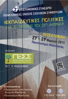 Σας γνωρίζουμε ότι η Πανελλήνια Ένωση Σχολικών Συμβούλων (Π.Ε.Σ.Σ.), διοργανώνει το 2ο Επιστημονικό Συνέδριο με θέμα «Εκπαιδευτικές Πολιτικές για το Σχολείο του 21ου Αιώνα». Το ανωτέρω συνέδριο θα λάβει χώρα στο Πανεπιστήμιο Μακεδονία, στη Θεσσαλονίκη στις 27-29 Μαρτίου 2015.Σας παραθέτουμε την αφίσα του συνεδρίου, το πρόγραμμα αυτού, χάρτη και οδηγίες για τη διευκόλυνση της πρόσβασή σας στο Πανεπιστήμιο Μακεδονία, και λοιπό πληροφοριακό υλικό.